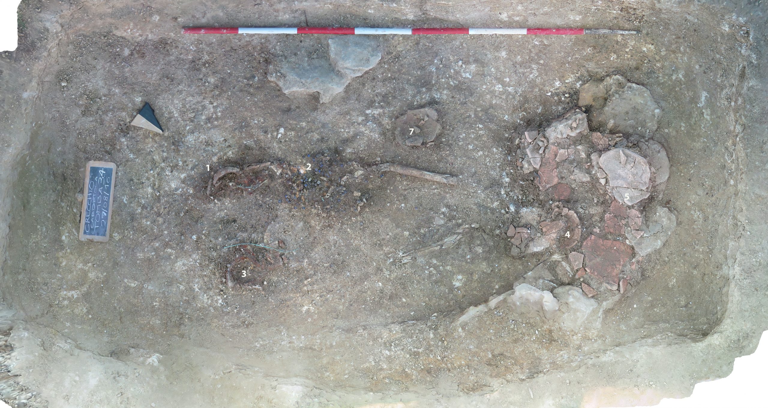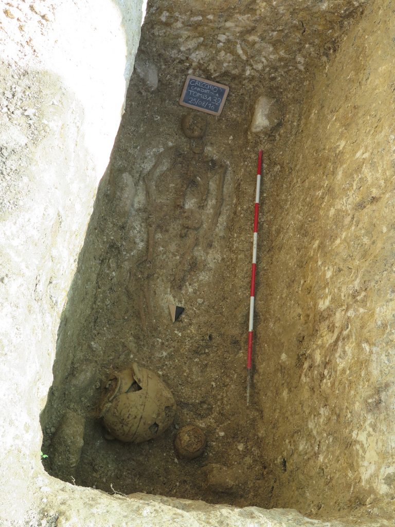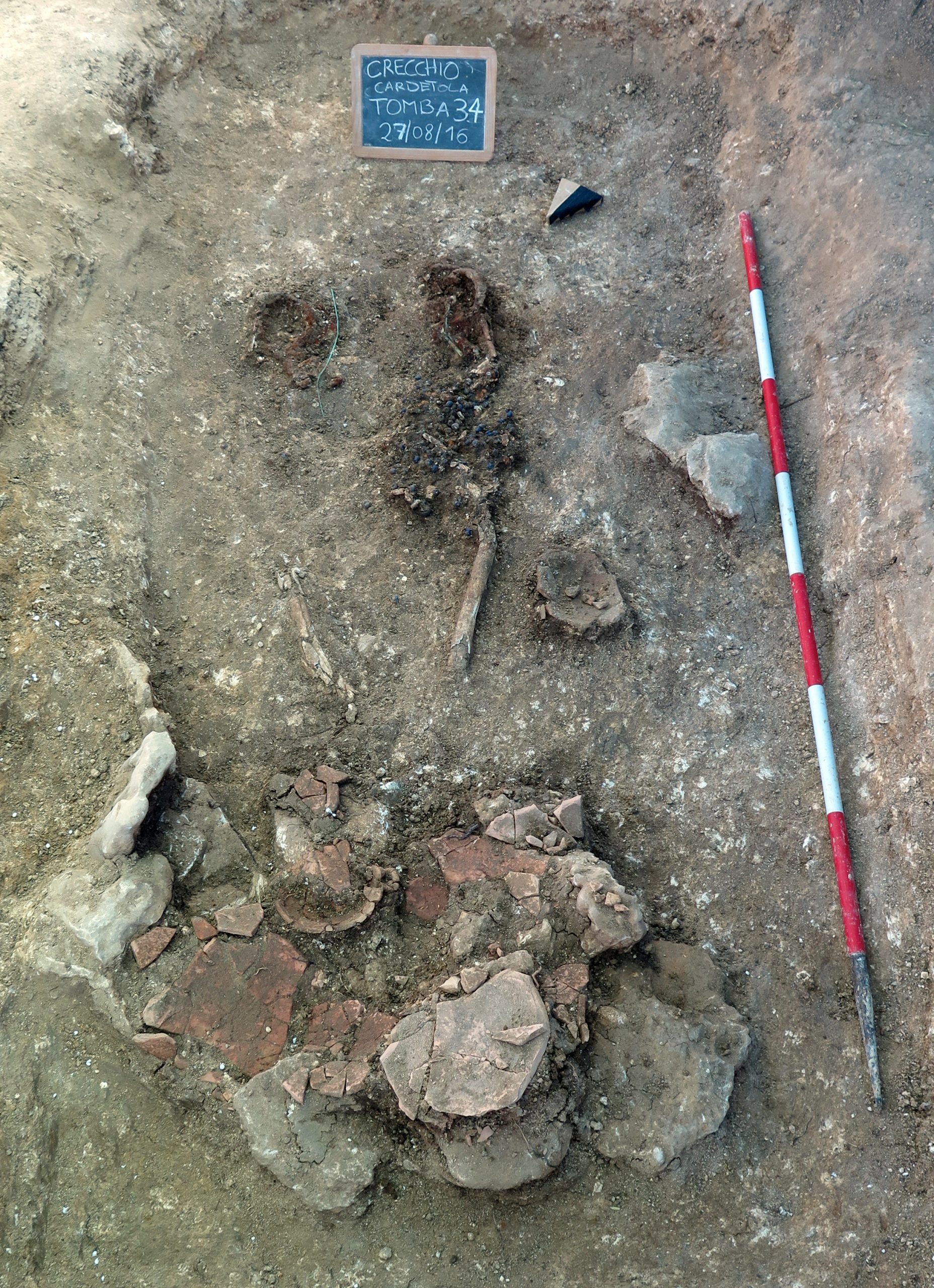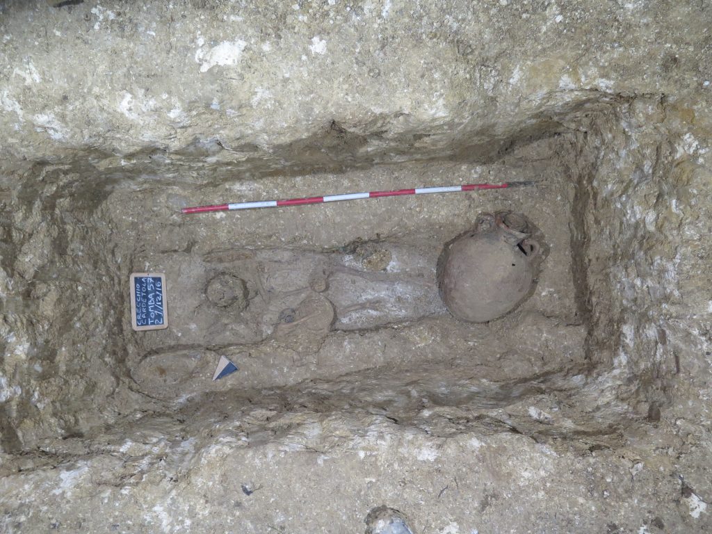 Le tombe sono organizzate in gruppi di forma pseudo-circolare, a suggerire la presenza di tumuli distrutti dall’agricoltura moderna che ha risparmiato solo le sepolture più profonde. Le singole tombe, costituite da fosse rettangolari profonde oltre 2 m, erano scavate nel terreno geologico e poi riempite di terra e pietre poggiate sulle tavole lignee, oggi scomparse, che un tempo proteggevano i corpi e gli oggetti di corredo. La vita del sito sembra poi continuare in epoca romana, una fase per ora ancora poco documentata