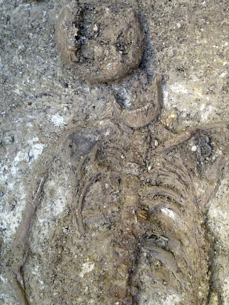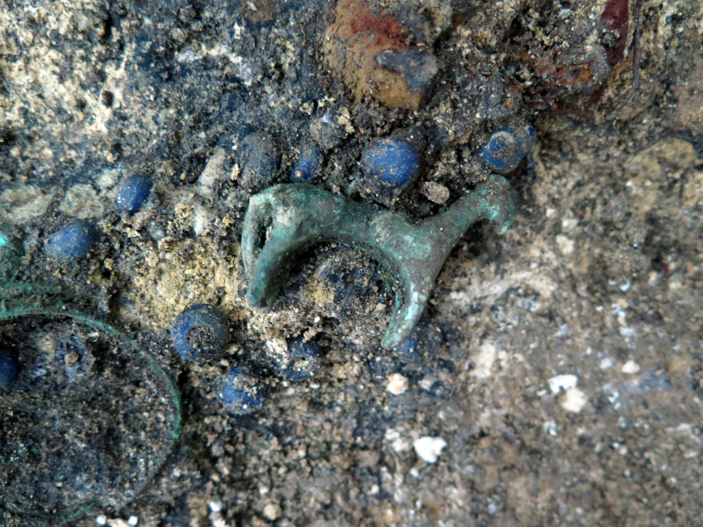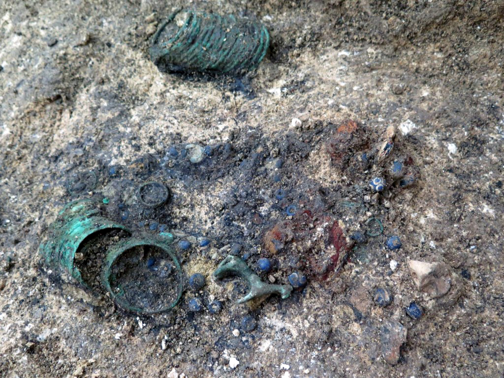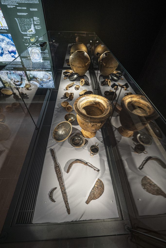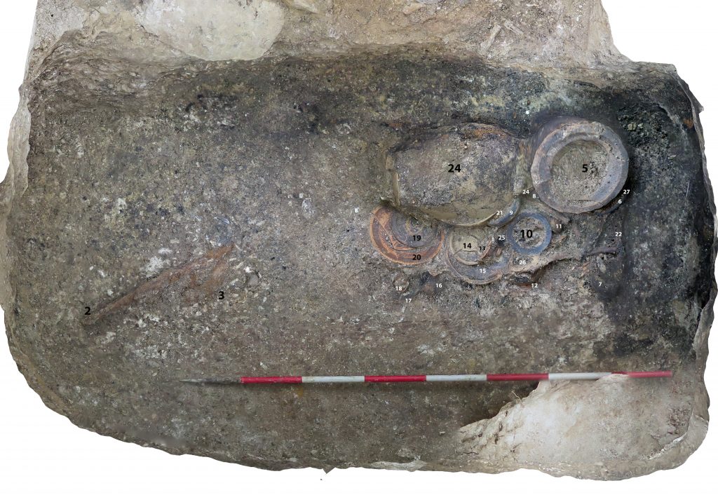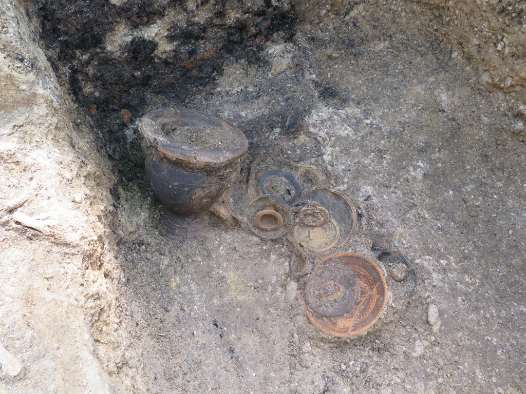Le tombe sono organizzate in gruppi di forma pseudo-circolare, a suggerire la presenza di tumuli distrutti dall’agricoltura moderna che ha risparmiato solo le sepolture più profonde. Le singole tombe, costituite da fosse rettangolari profonde oltre 2 m, erano scavate nel terreno geologico e poi riempite di terra e pietre poggiate sulle tavole lignee, oggi scomparse, che un tempo proteggevano i corpi e gli oggetti di corredo. La vita del sito sembra poi continuare in epoca romana, una fase per ora ancora poco documentata
